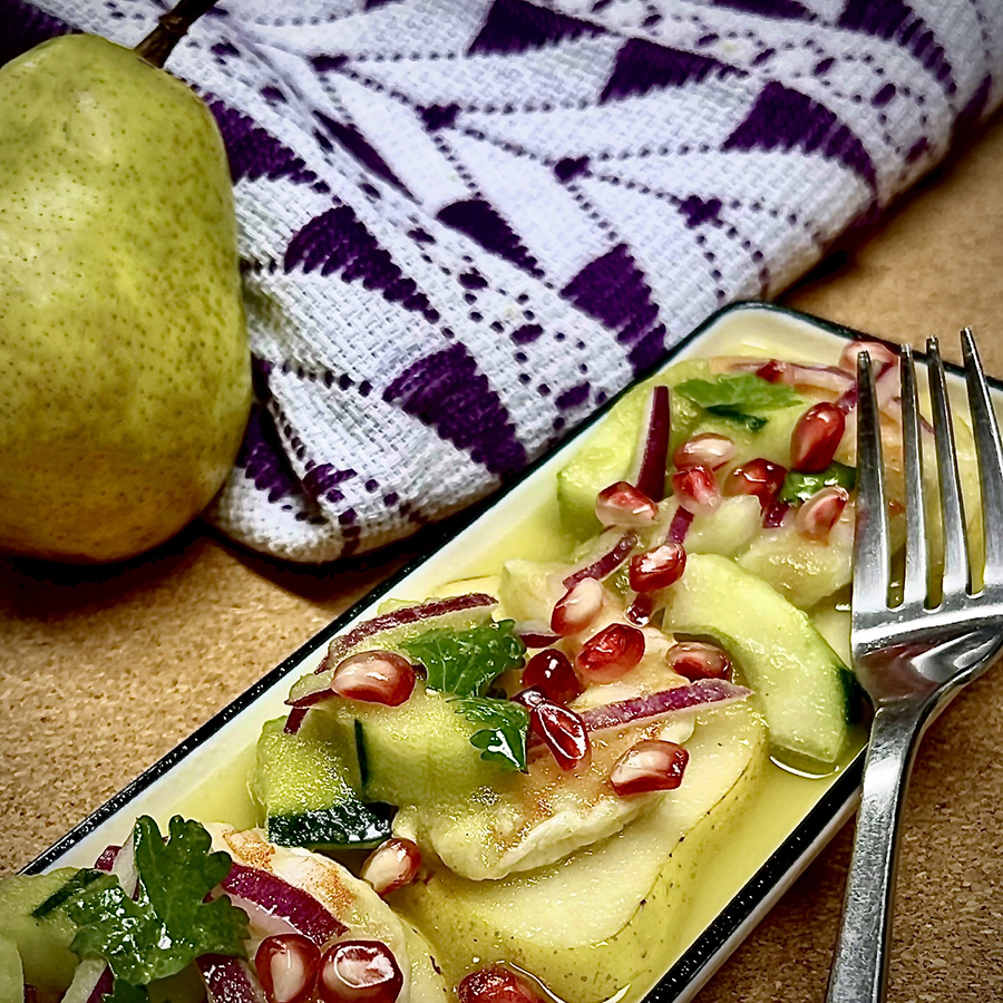Dispón las rebanadas de pera en el plato como base y sirve la preparación. Se decora con granada y cilantro picadito. Se puede comer con tostaditas de maíz.